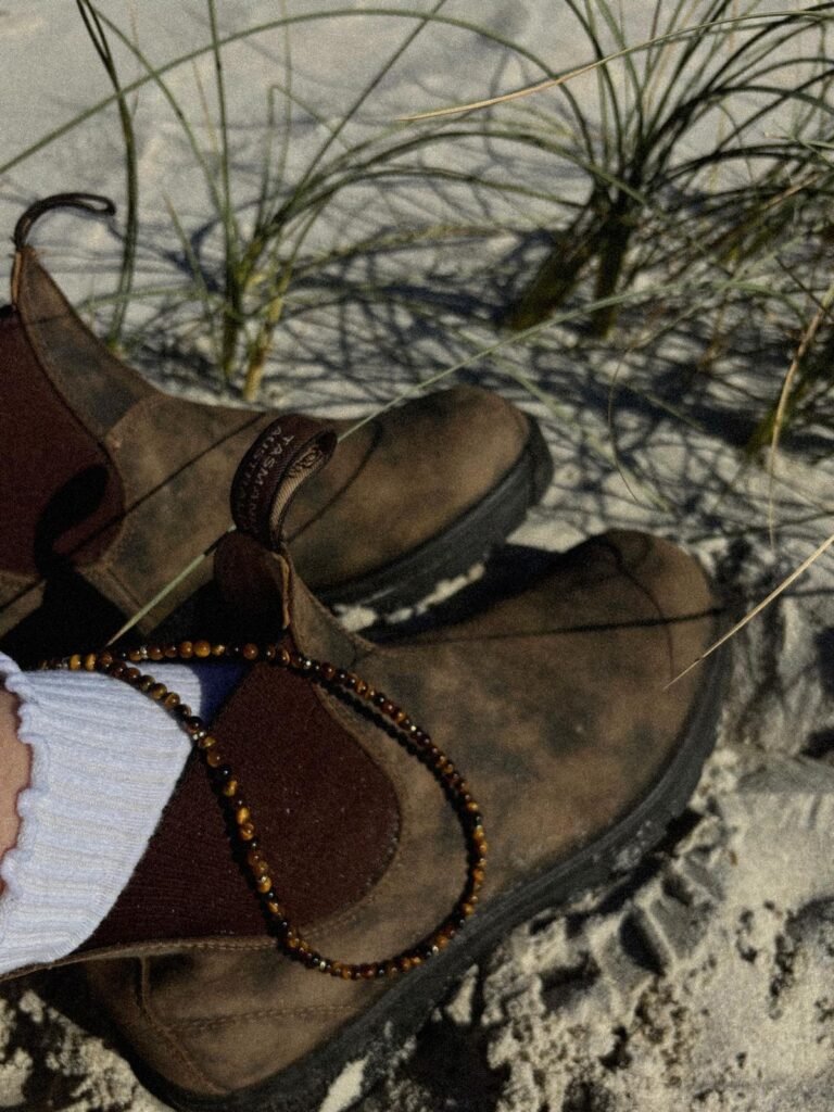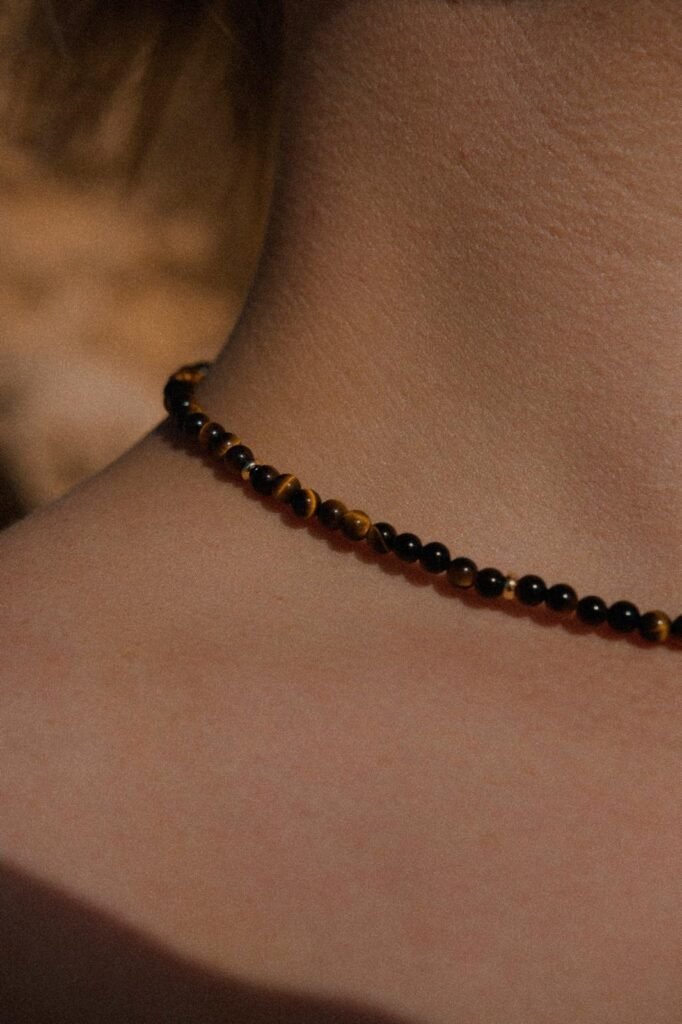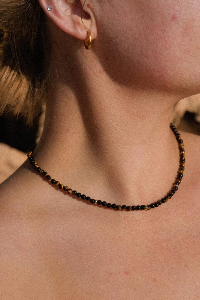 The Oculus Necklace, made from tigers eye beads and gold filled beads. Princess length is $70, choker is $60