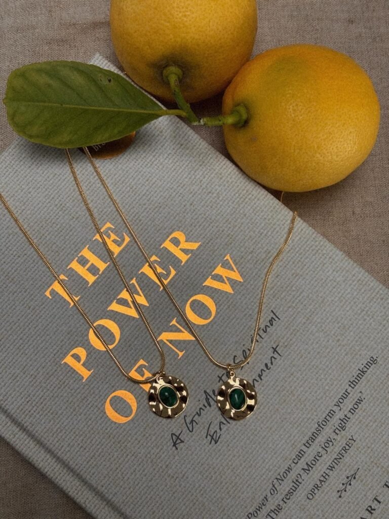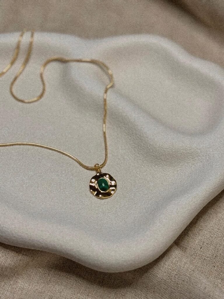 The Aurelia Necklace, made with gold filled chain and a gold filled pendant with a malachite stone. Necklace is $60