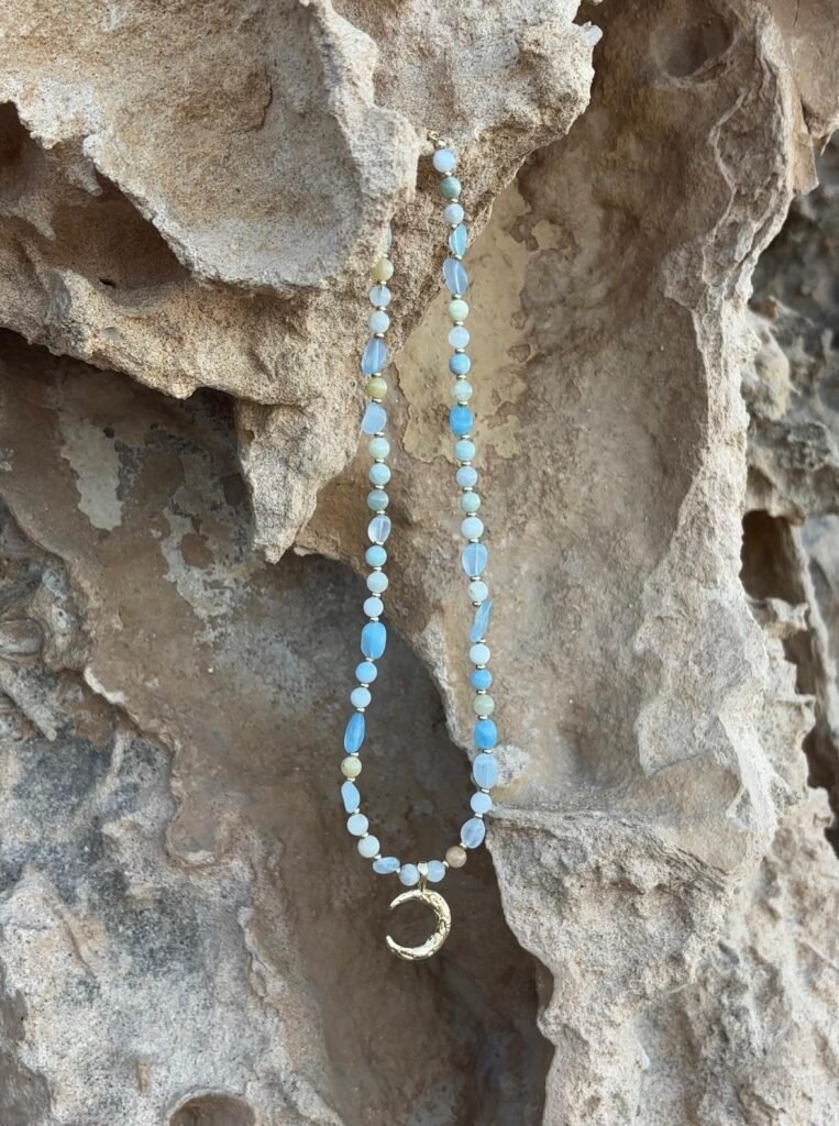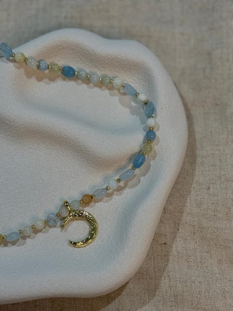 The Azure Necklace. Made from aquamarine beads, gold filled beads and a gold filled moon pendant. Princess length is $80, choker is $70