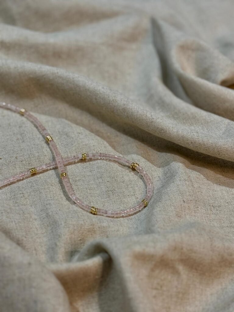 The Mirella Necklace. Made from rose quartz beads and gold filled beads. Princess length is $70, choker is $60