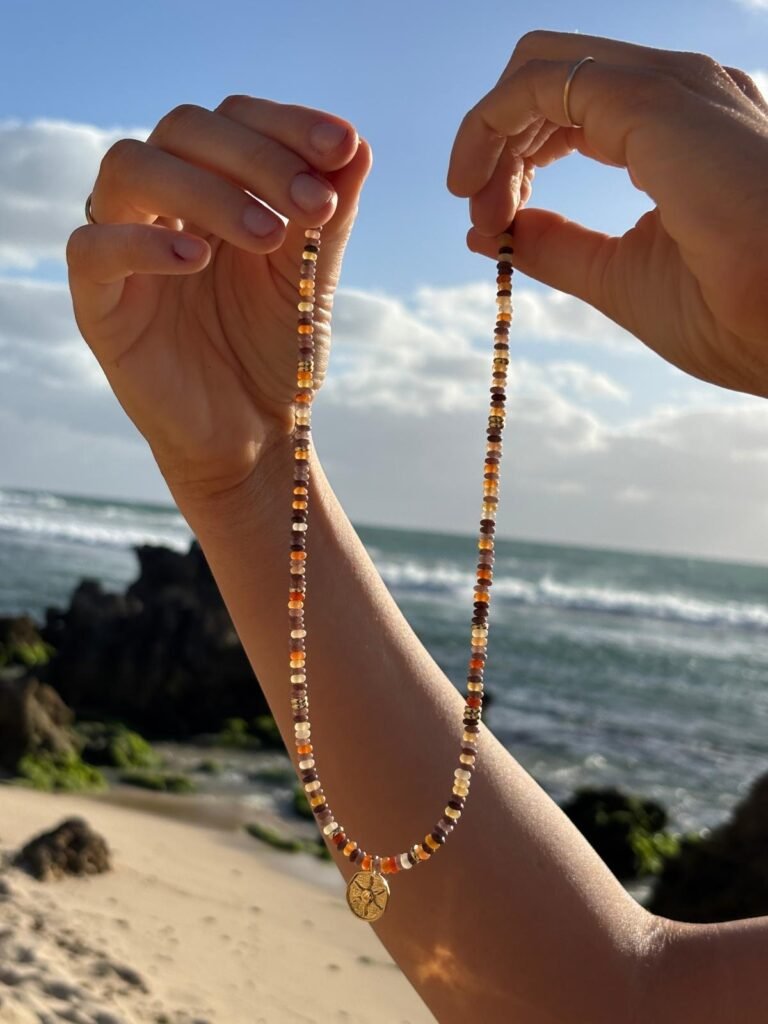 The Ember Necklace, made with red and brown aventurine beads, gold filled beads and a gold filled sun pendant. Princess length is $80, choker is $70
