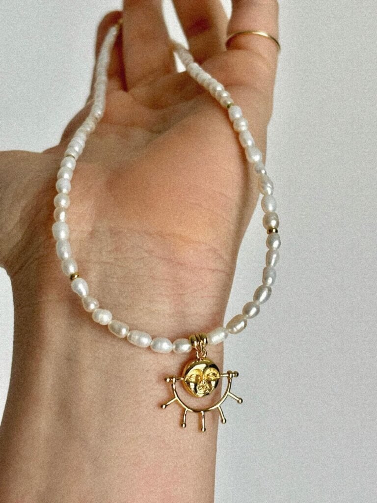 The Lumira Necklace. Made with freshwater pearls, gold filled beads and a gold filled abstract sun pendant. Princess length is $100, choker is $90