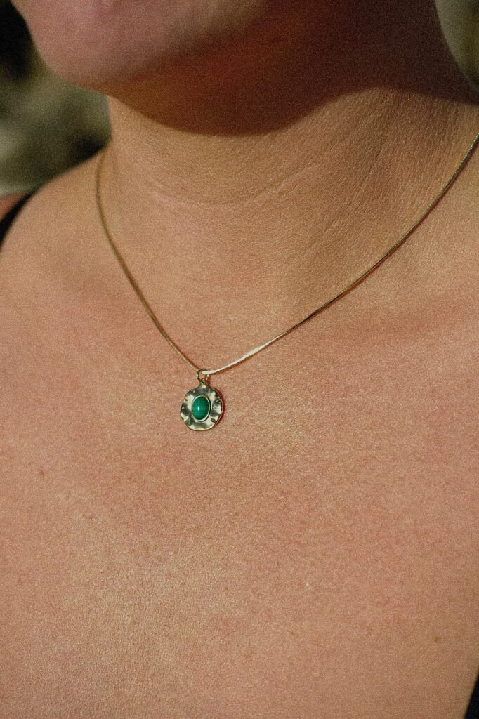 Introducing the Aurelia Necklace - where radiant gold meets the transformative power of malachite. This piece features a rich green malachite stone set in a gleaming gold-filled pendant suspended from...