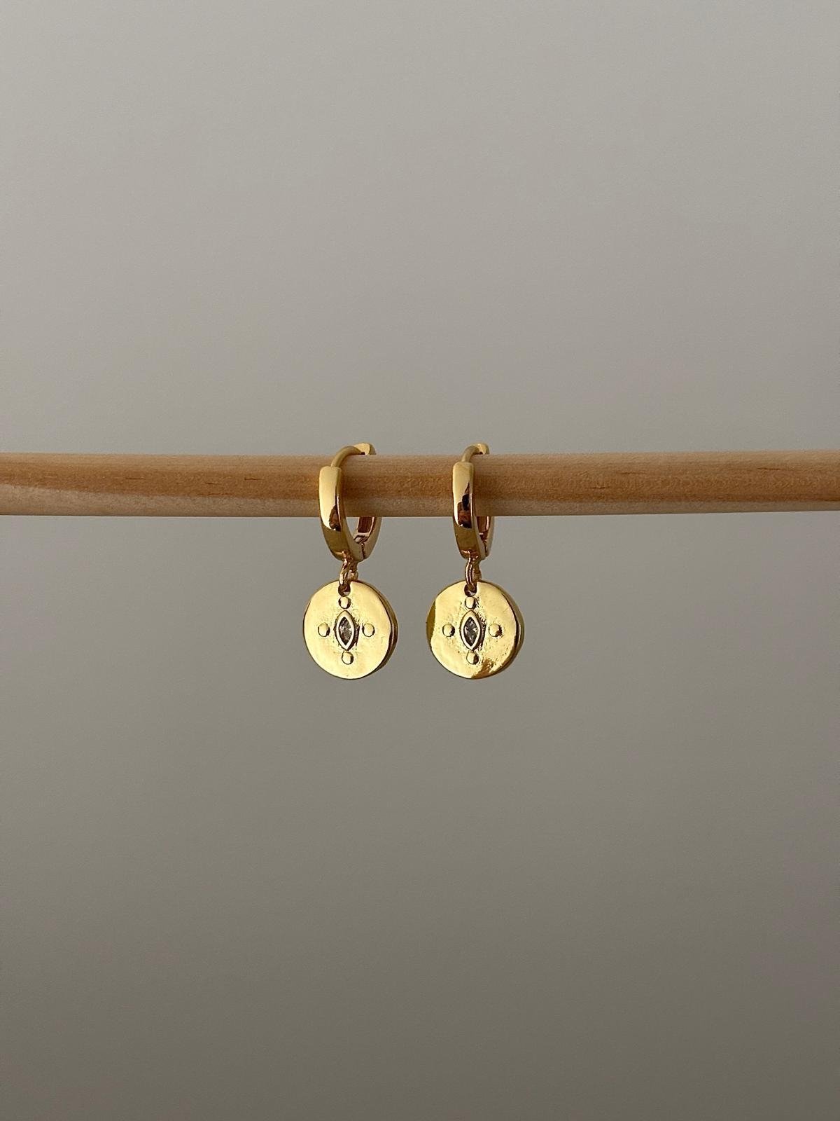 Coin Earrings. Gold filled huggies, gold filled coin pendants.