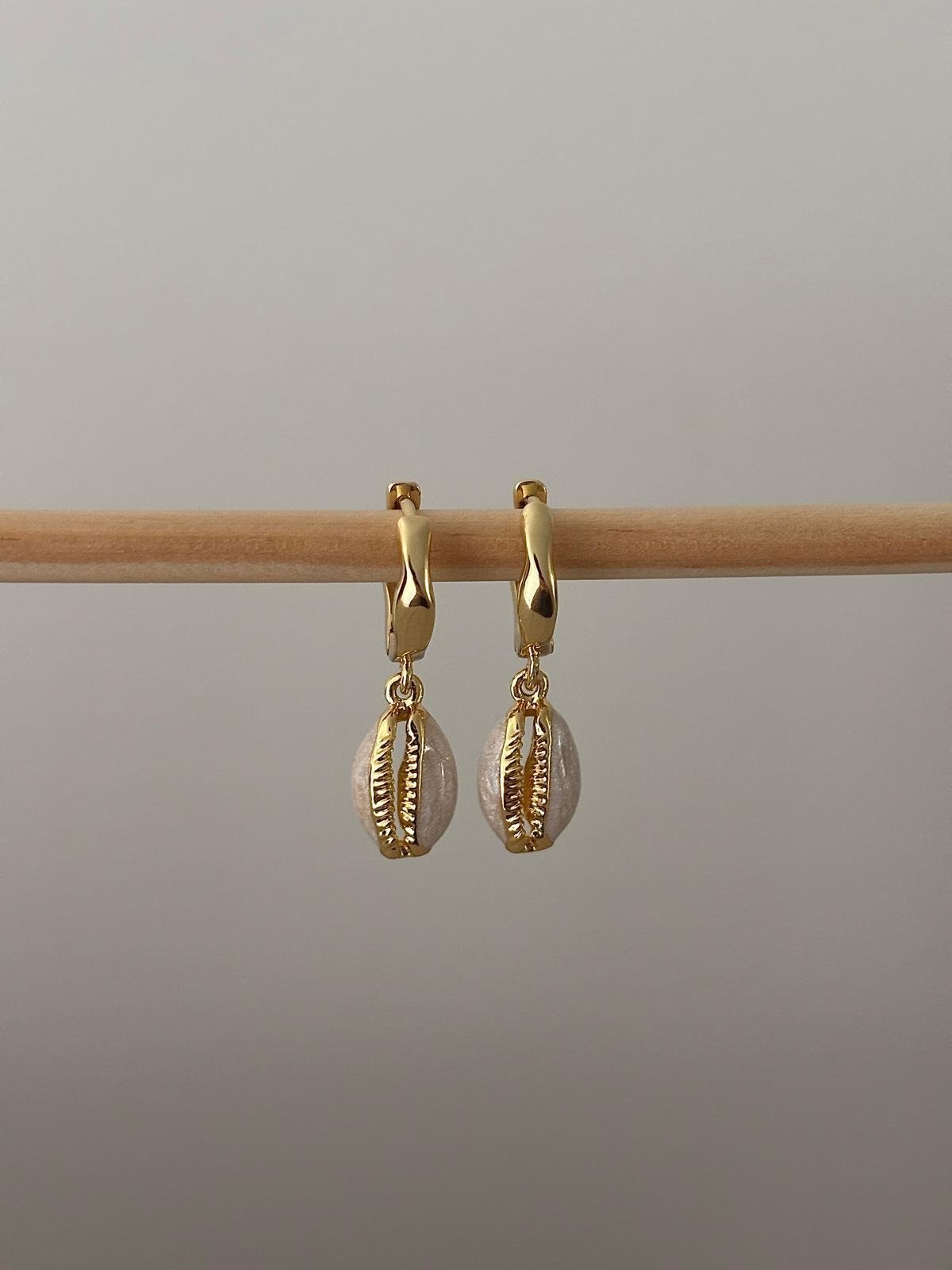 Cowrie Earrings. Gold-filled huggies, gold plated cowrie shell pendants.