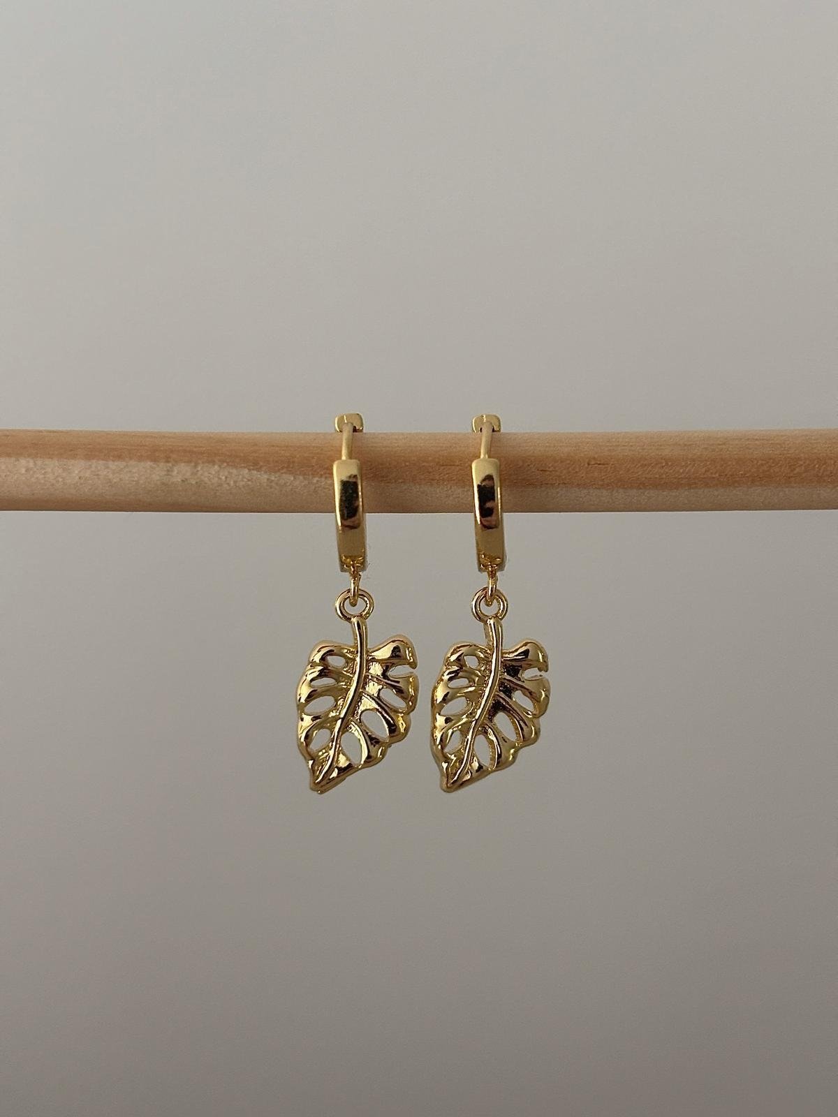 Monstera Earrings. Gold filled huggies and monstera leaf pendants.