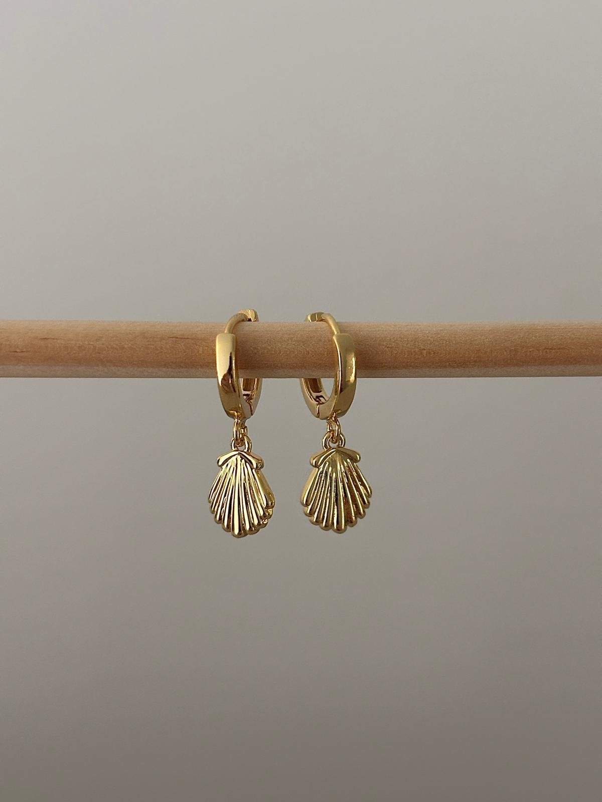 Shell Earrings. Gold filled huggies, gold shell pendants,
