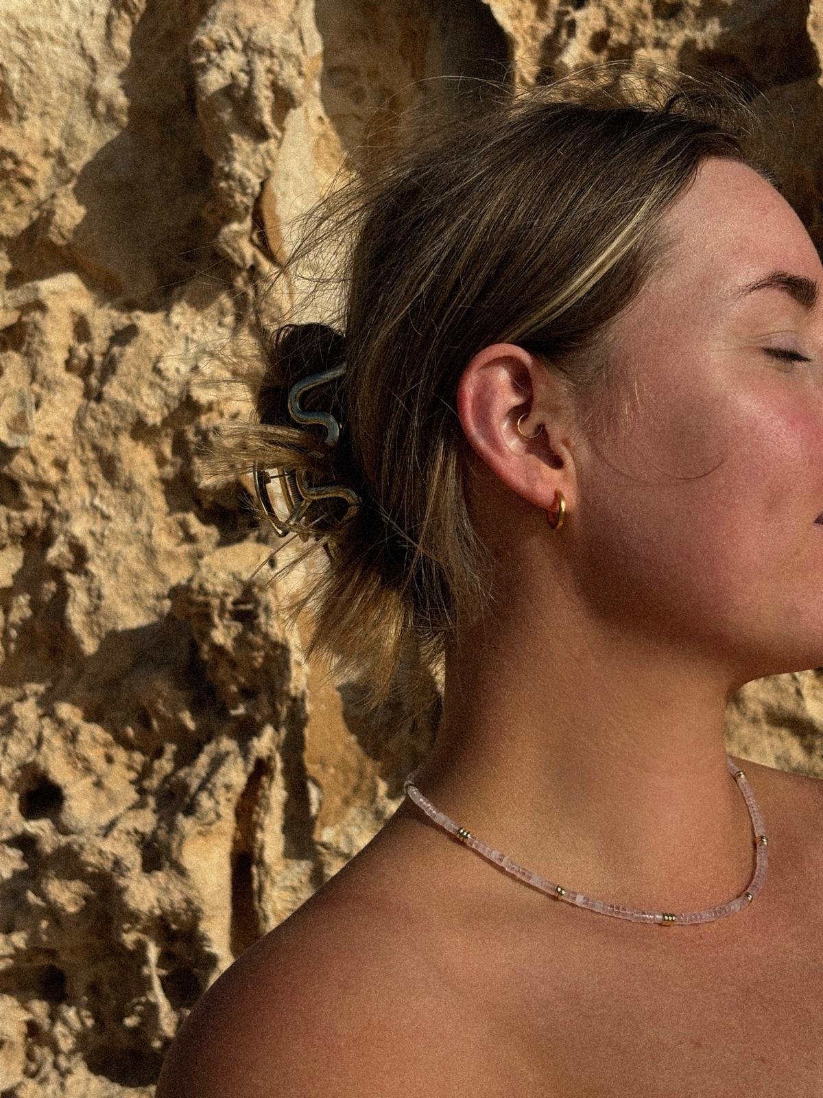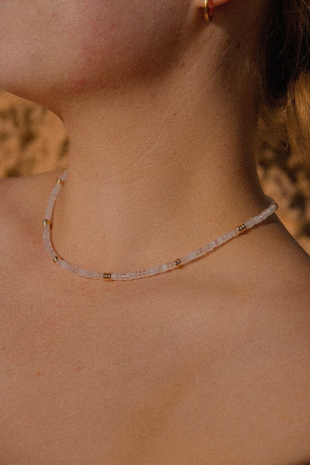 The Mirella Necklace. Made from rose quartz beads and gold filled beads. Princess length is $70, choker is $60