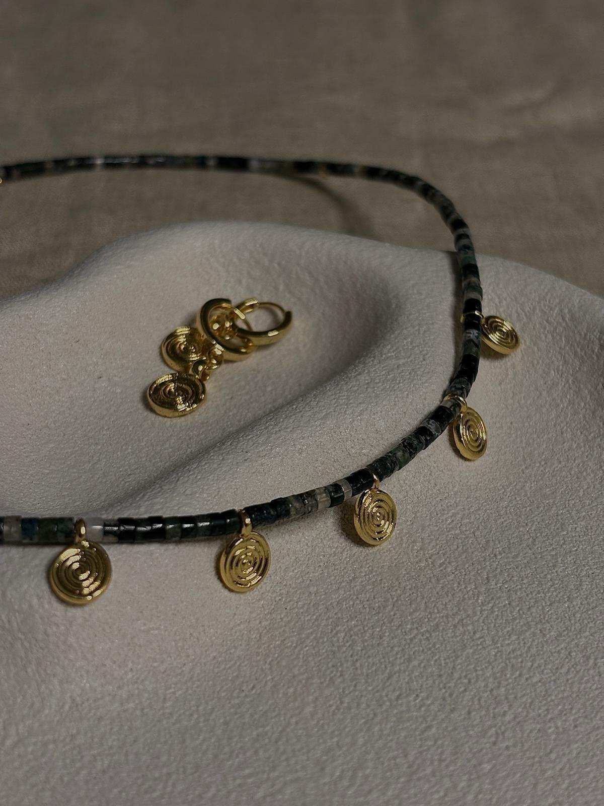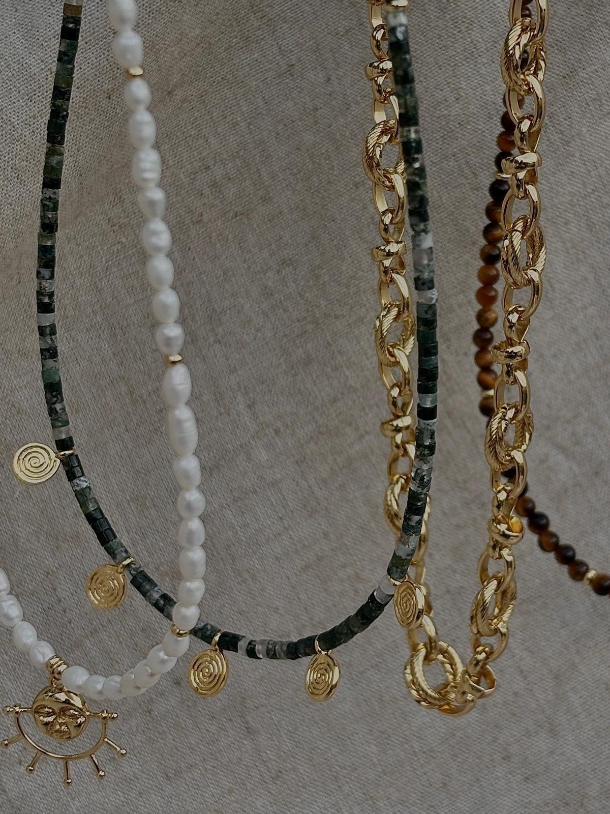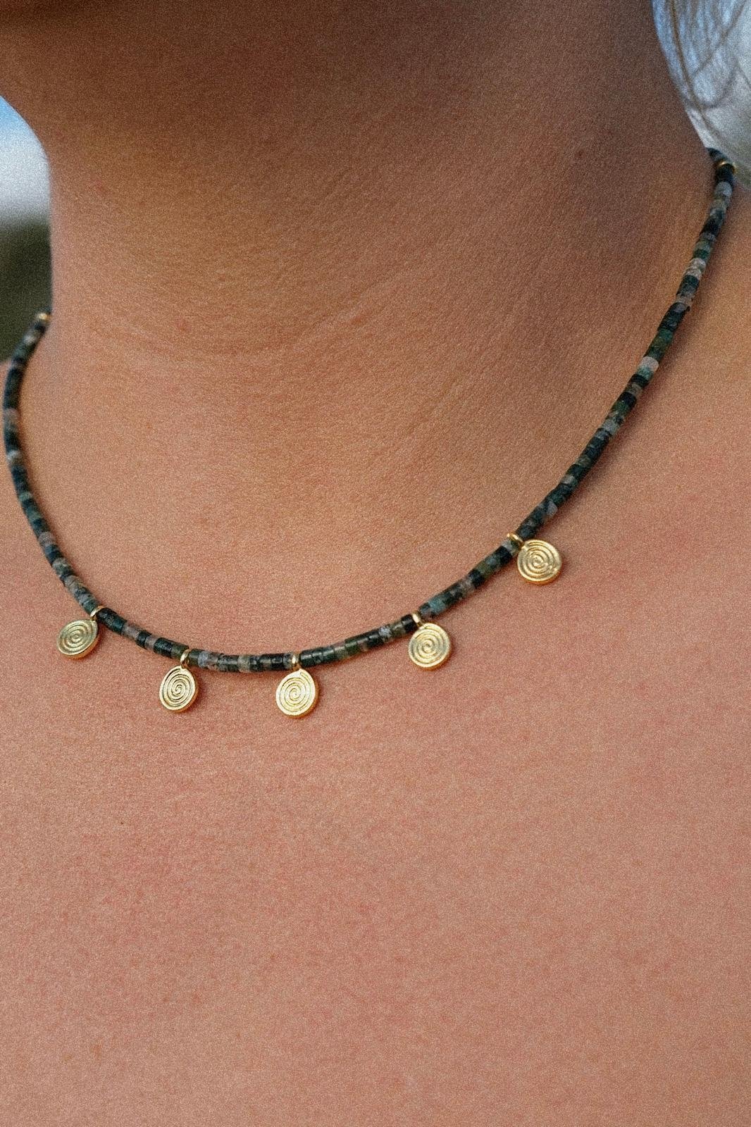 The Verdara Necklace. Made with moss agate beads, gold filled beads, and gold plated